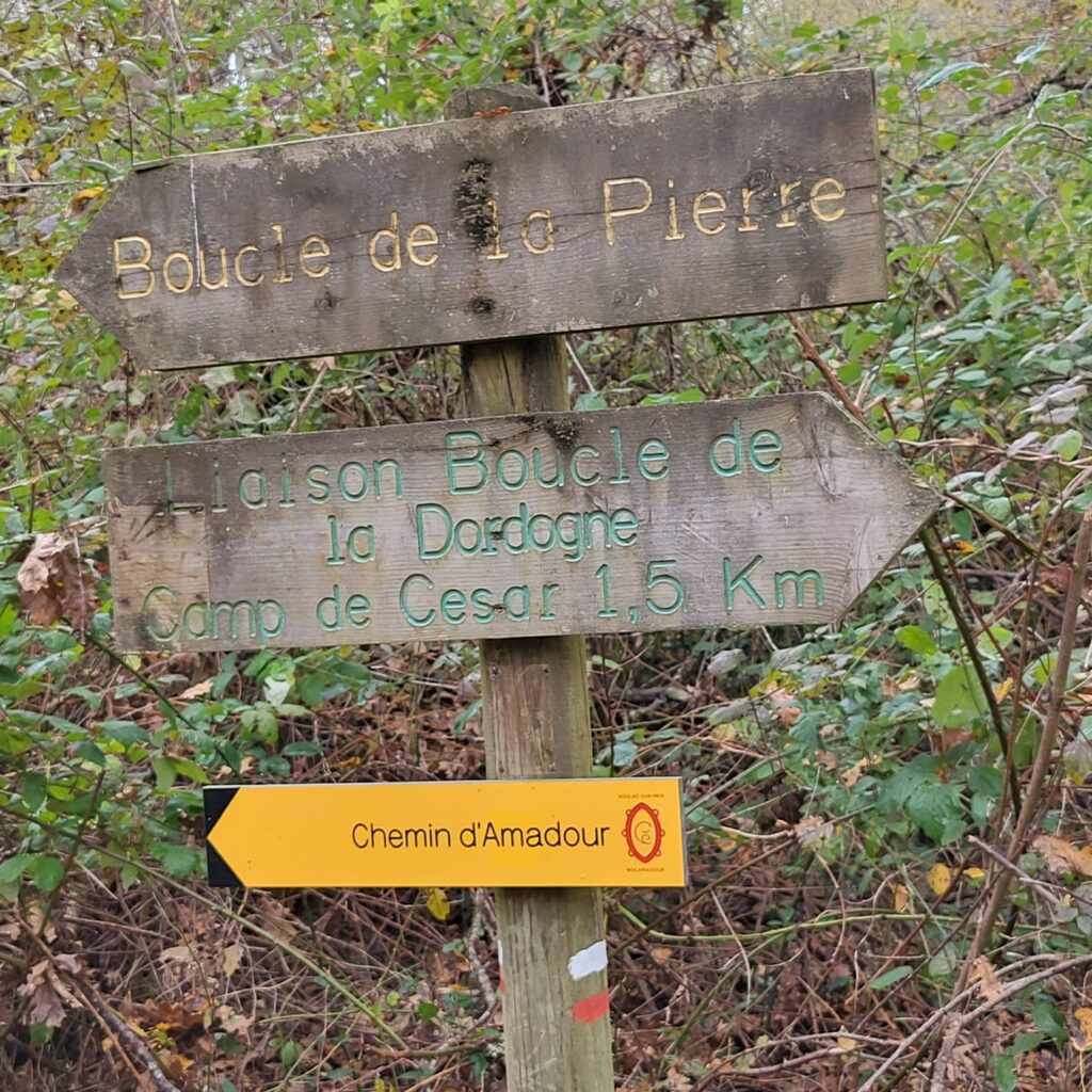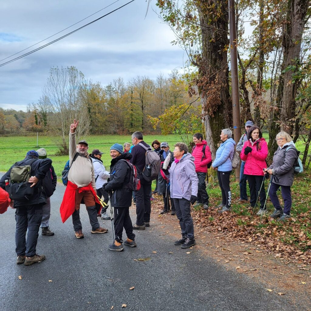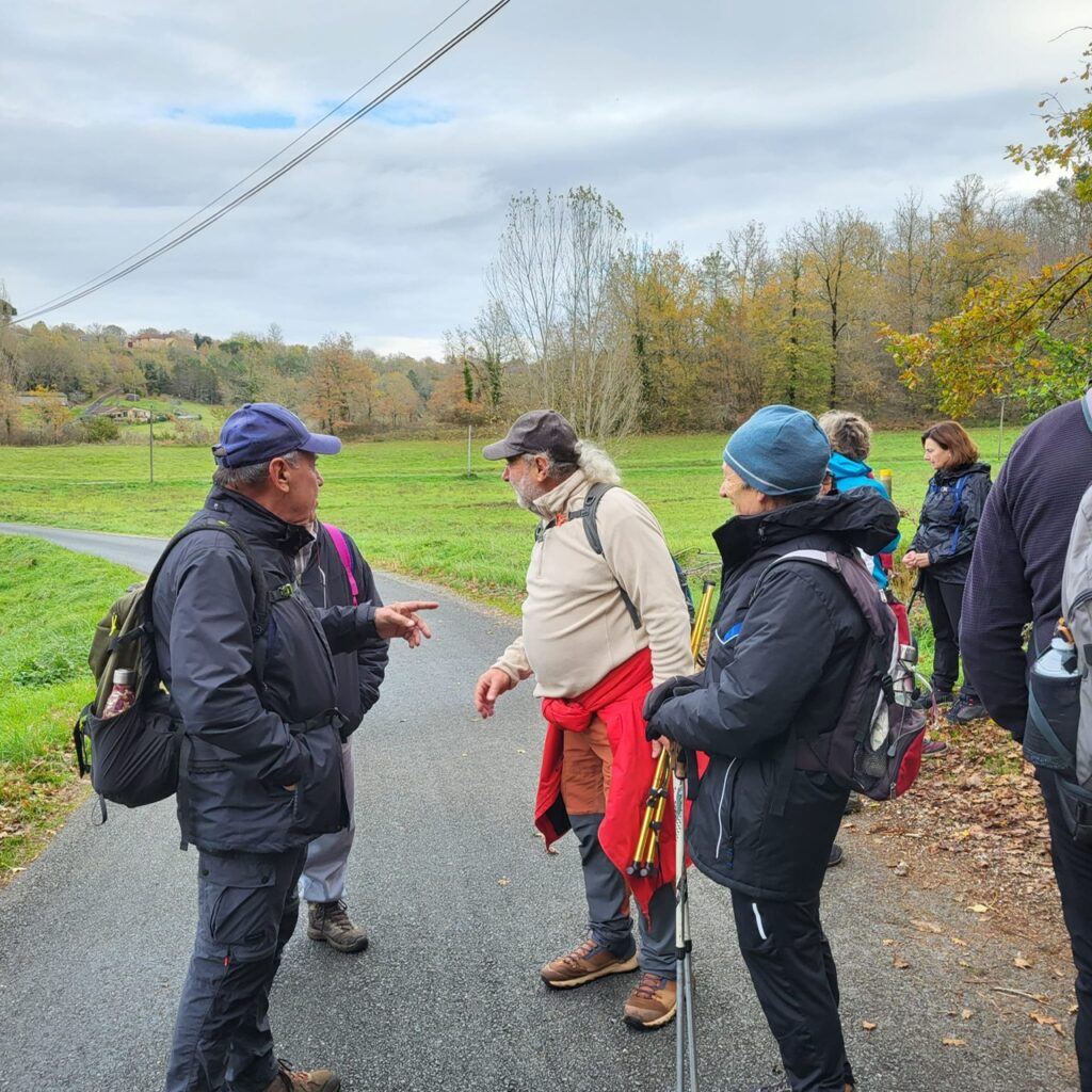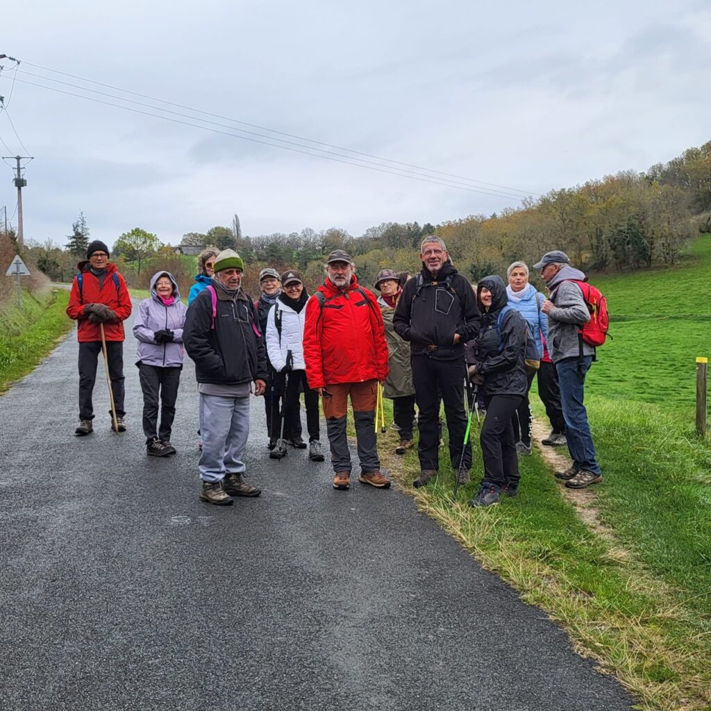 Mais à BPBC nous ne nous laissons pas distraire par l’outre rein, ni même par la pluie qui tombe, ni par le froid qui attend son heure. On s’habille sérieusement, on compte les courageux présents sans trop les reconnaitre sous les capuches, on n’oublie pas la photographe : 18 pour tourner pendant 8 km (boucle de la Pierre), autour du magnifique et vieux village (XIème s.) aux sept clochers. Amadour, lorsqu’il passât par cette forêt de la Bessède parlait aux gens d’un repas auquel il a assisté (cène), d’un visage en sang qu’il a nettoyé (le Christ)… le GR81 (600 km)… la légende.