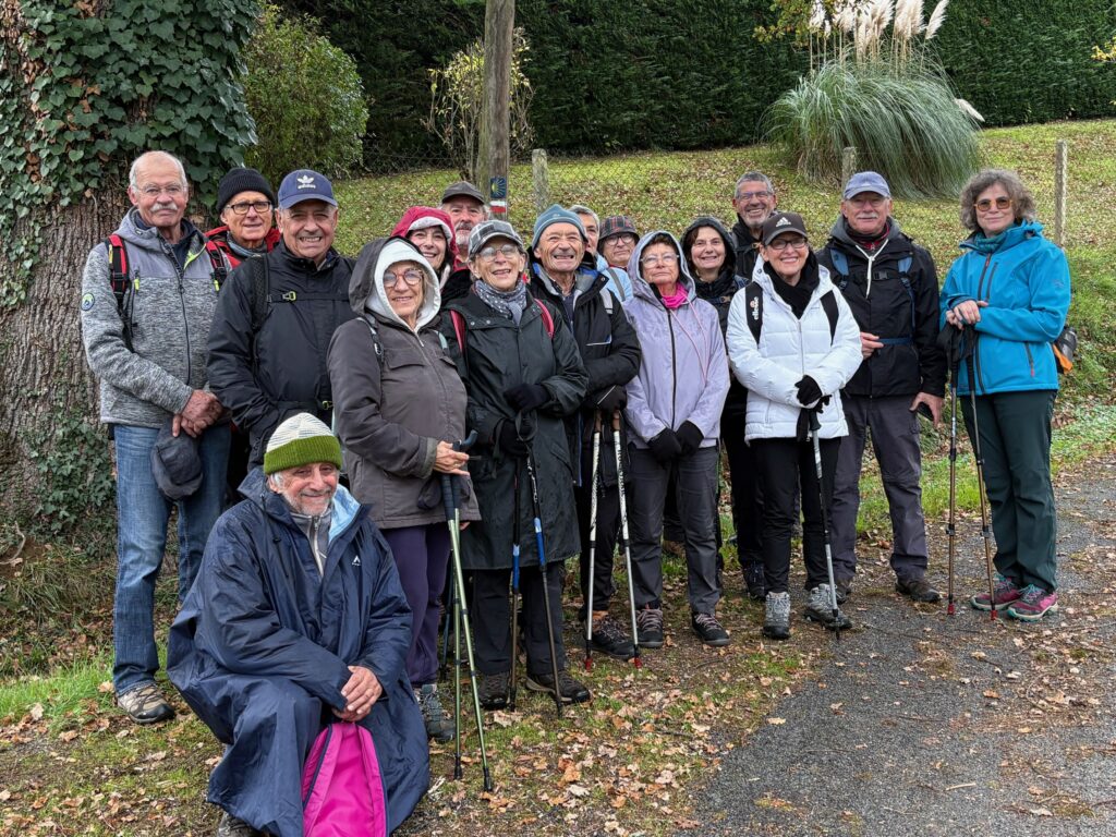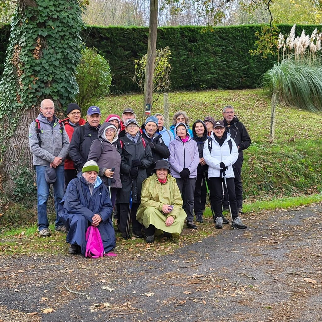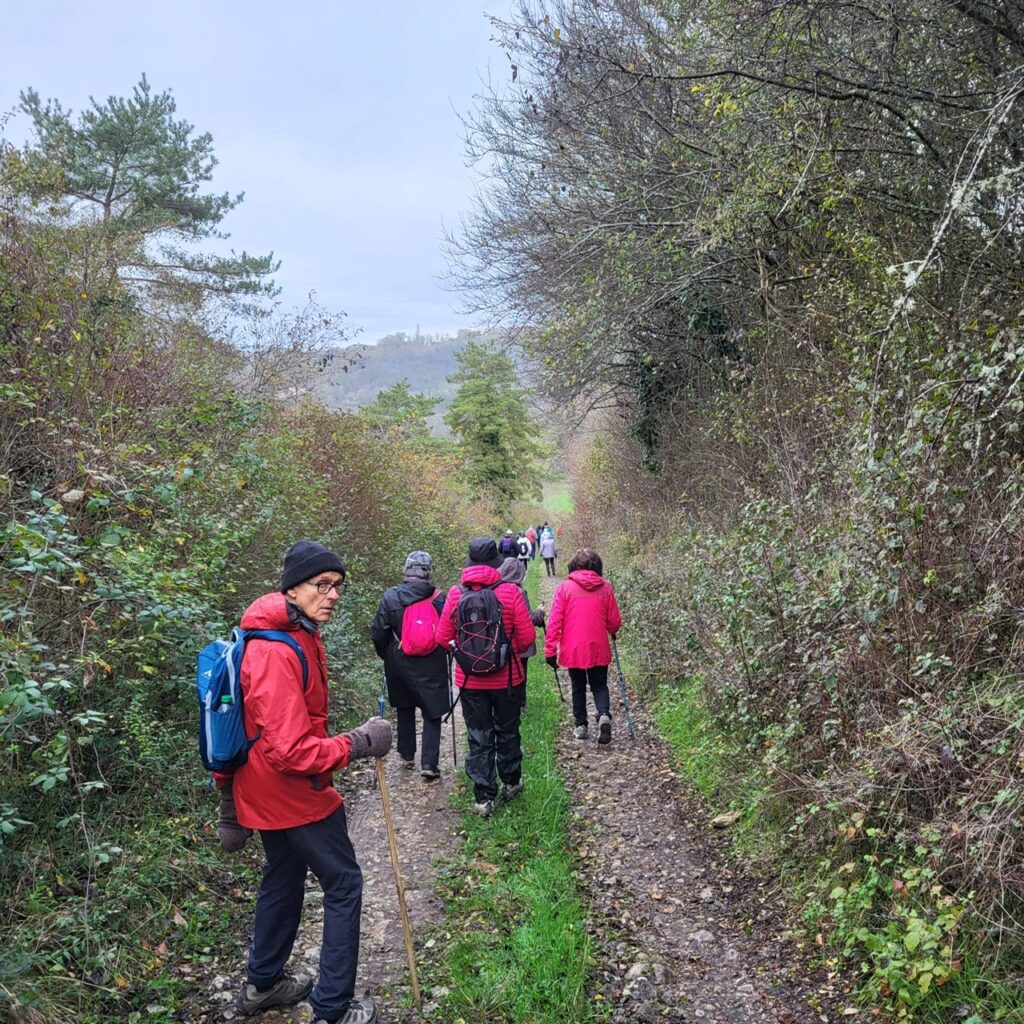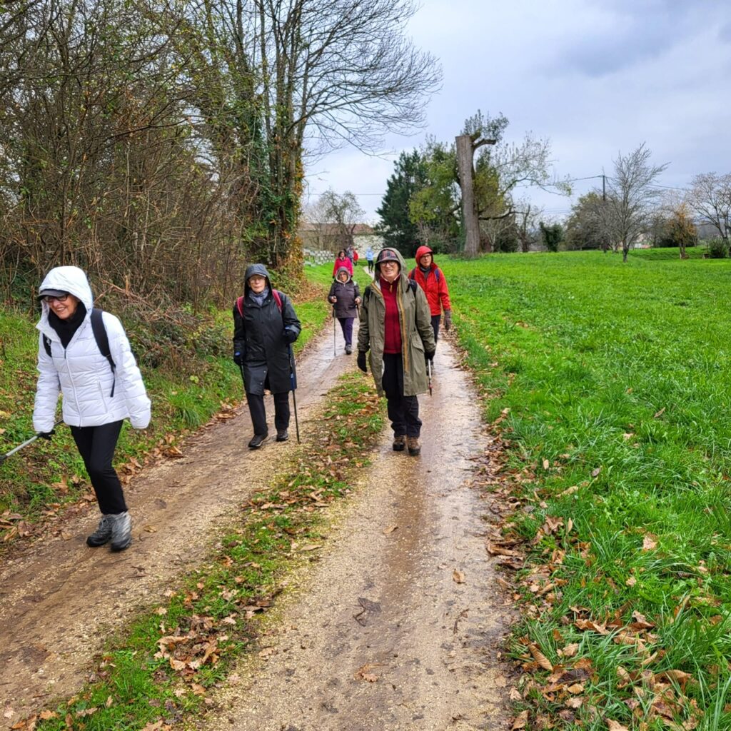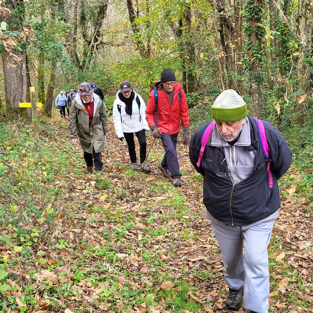 Mais à BPBC nous ne nous laissons pas distraire par l’outre rein, ni même par la pluie qui tombe, ni par le froid qui attend son heure. On s’habille sérieusement, on compte les courageux présents sans trop les reconnaitre sous les capuches, on n’oublie pas la photographe : 18 pour tourner pendant 8 km (boucle de la Pierre), autour du magnifique et vieux village (XIème s.) aux sept clochers. Amadour, lorsqu’il passât par cette forêt de la Bessède parlait aux gens d’un repas auquel il a assisté (cène), d’un visage en sang qu’il a nettoyé (le Christ)… le GR81 (600 km)… la légende.